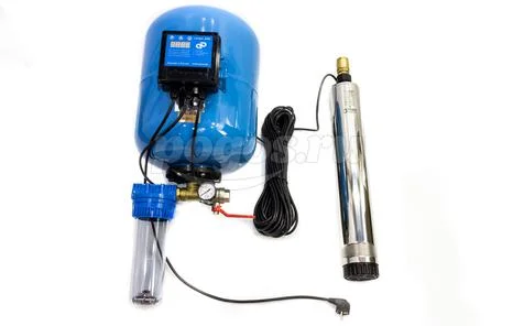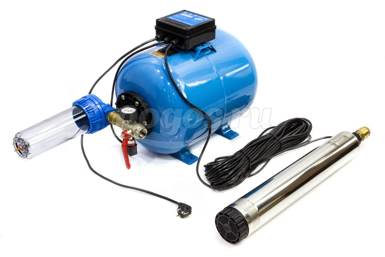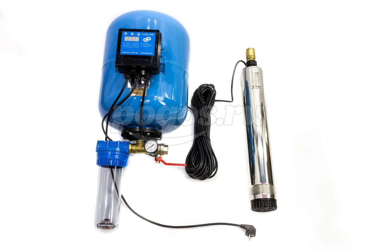 Система состоит из погружного скважинного насоса Водомет 55/75, электронного блока управления, вертикального гидроаккумулятора из нержавеющей стали на 50 литров, датчика давления, фильтра и манометра. Эту систему Водомет Дом используют для водоснабжения жилых домов, она имеет защиту от перепадов напряжения и "сухого хода".