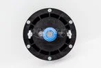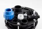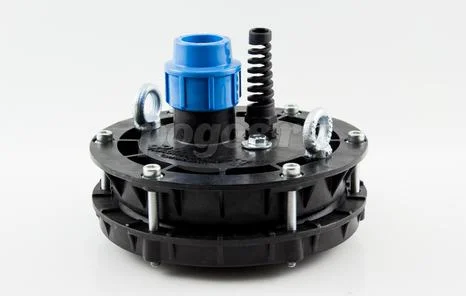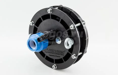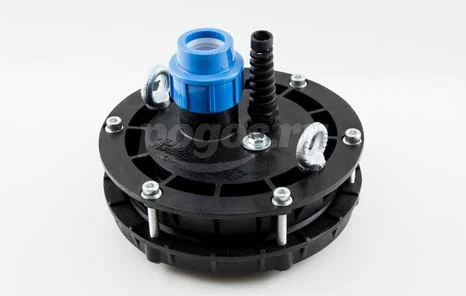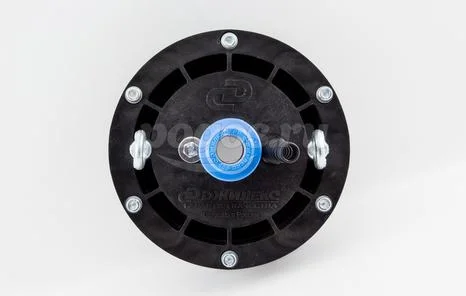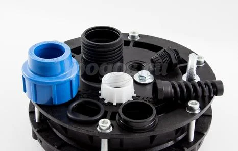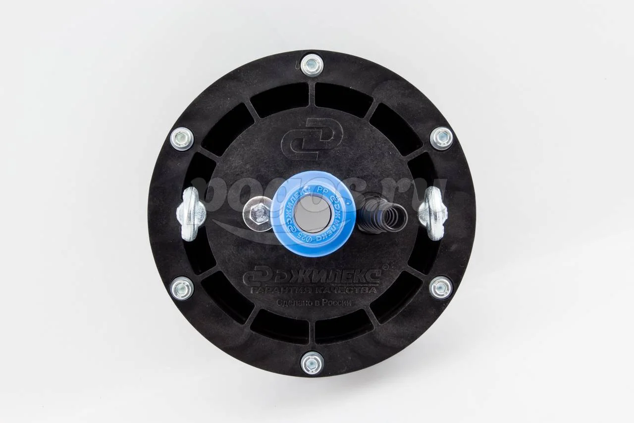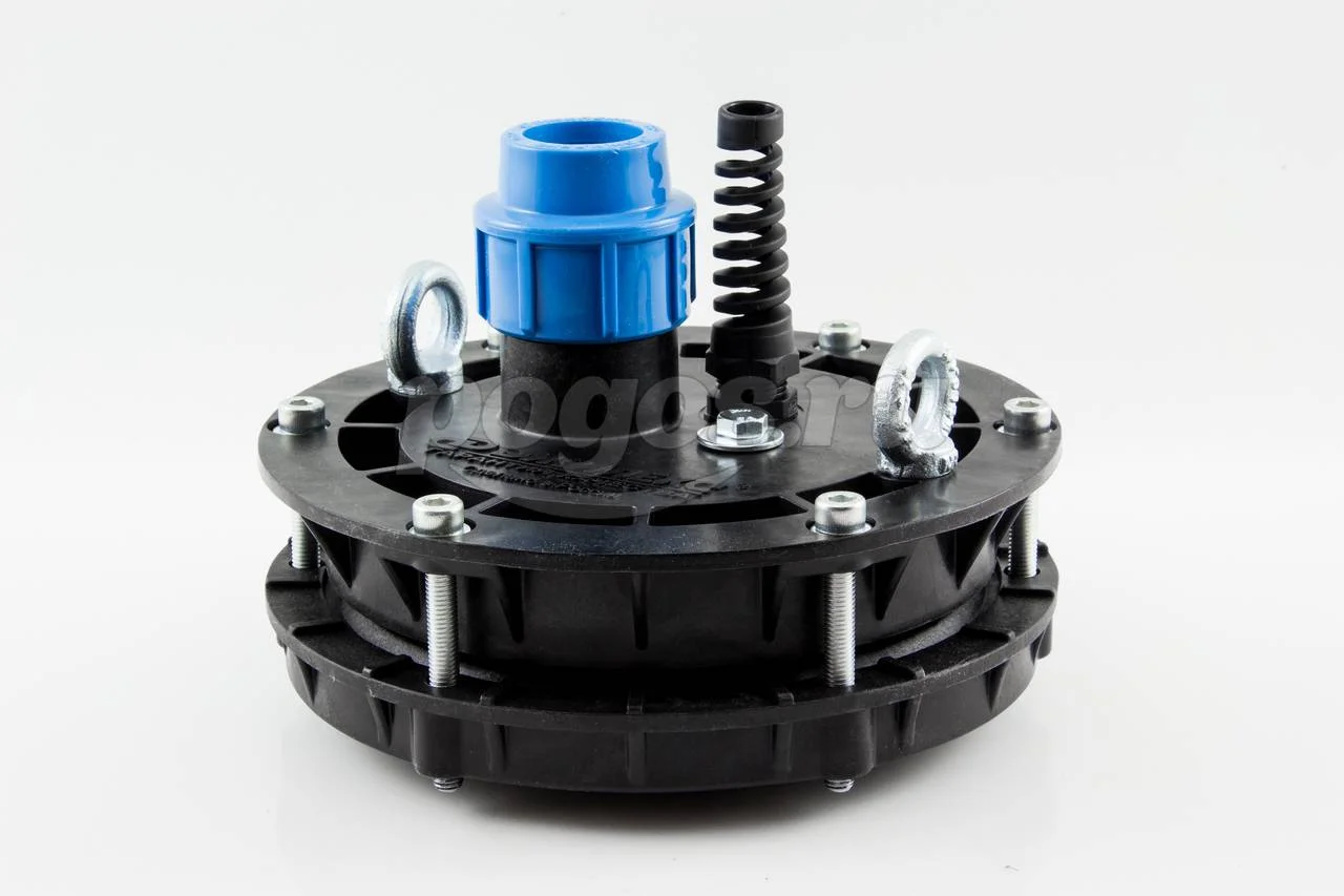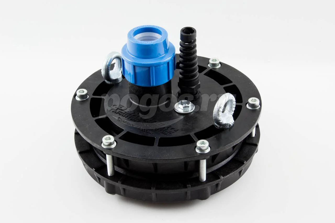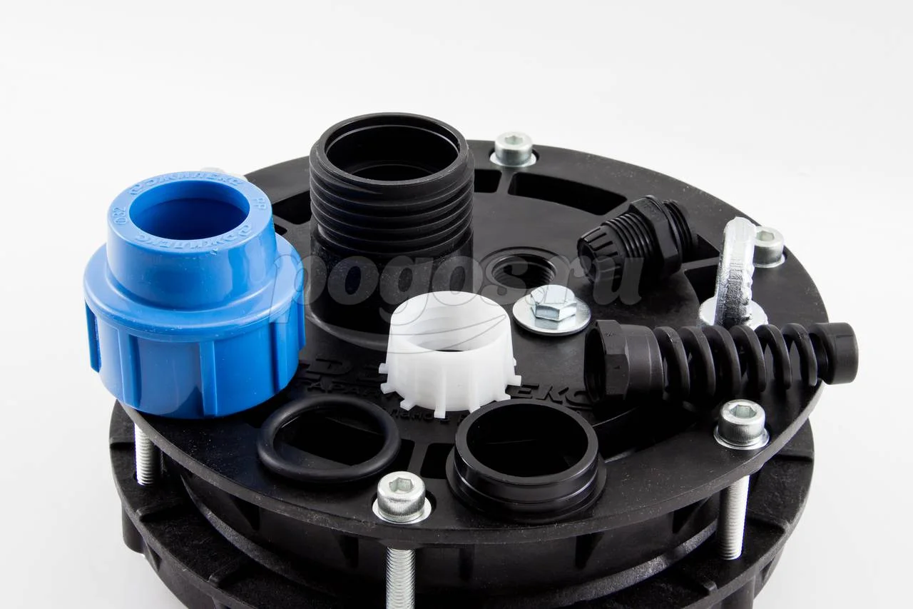 Приспособление выполнено из пластика и представляет собой крышку с прижимным фланцем и кольцом из резины. Сверху на нем располагаются стальные рым-болты для прикрепления подъемных устройств, используемых при опускании насоса в скважину.