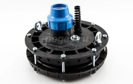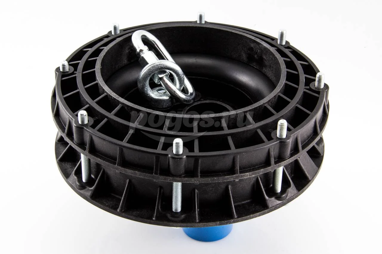 На нижней поверхности оголовка имеется карабин для закрепления троса. Изделие легко устанавливается без применения сварочного аппарата за счет стягивания уплотнительного кольца с помощью болтов на крышке.