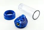 Он изготовлен из прочного прозрачного полипропилена пищевого класса, крышка – из синего полипропилена с латунными резьбовыми вставками.