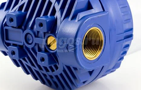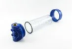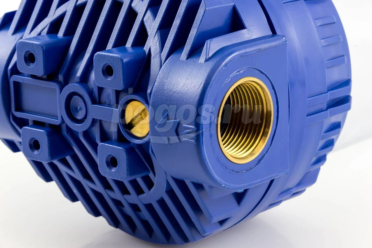 - Материал: крышка — синий полипропилен с латунными резьбовыми вставками, корпус — прозрачный SAN.