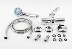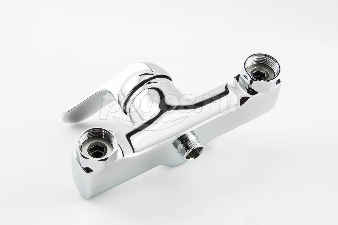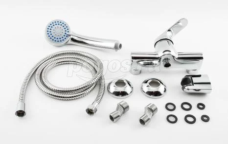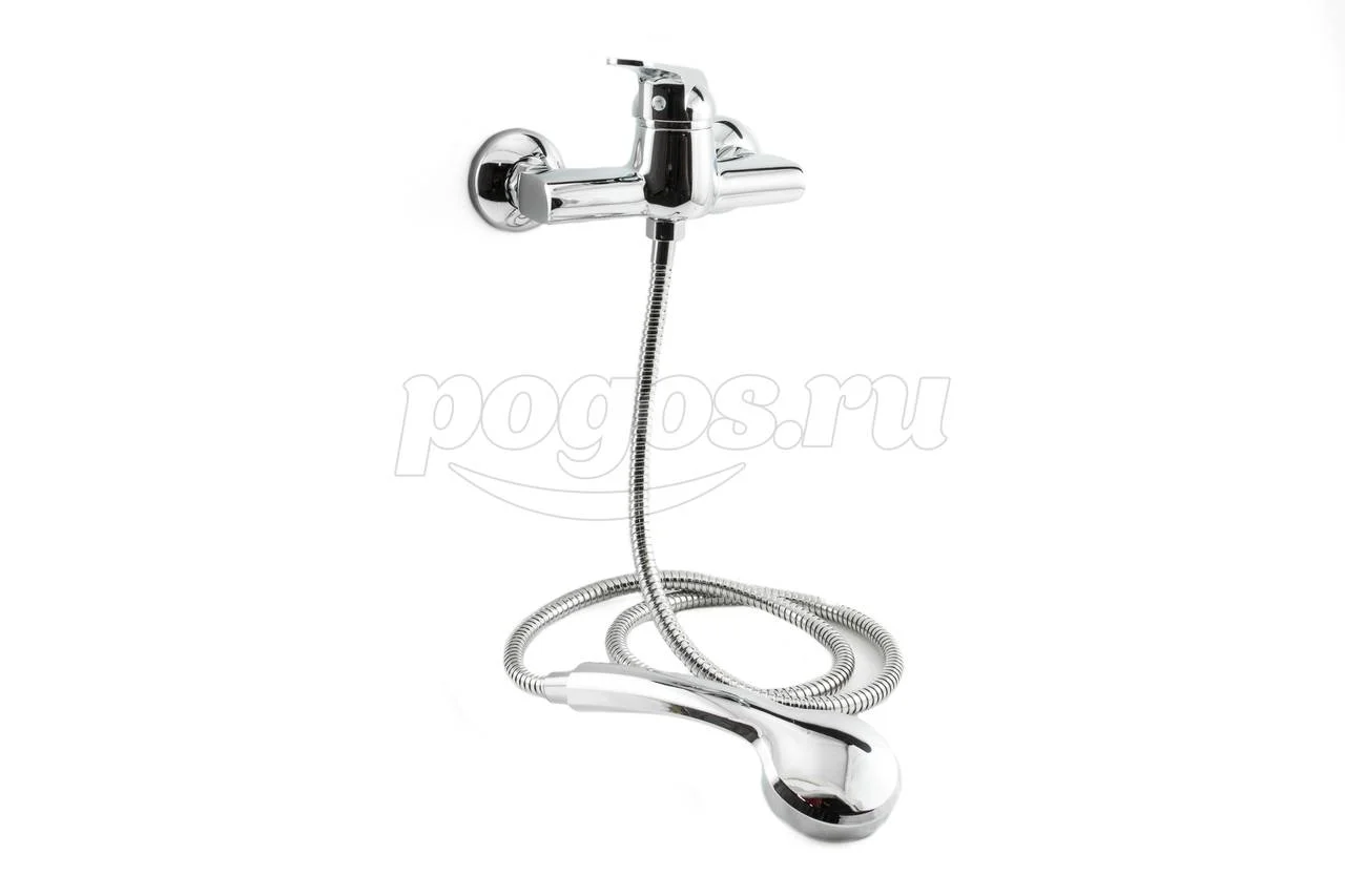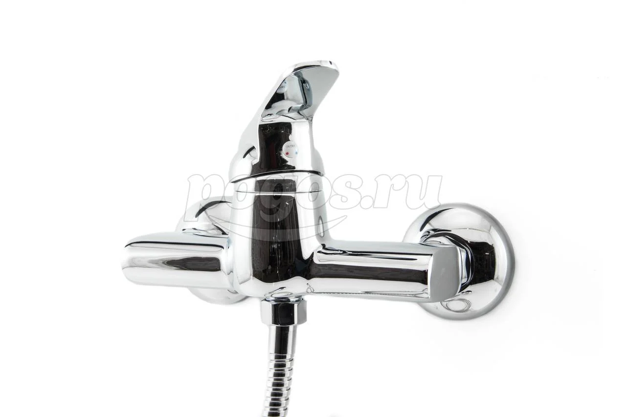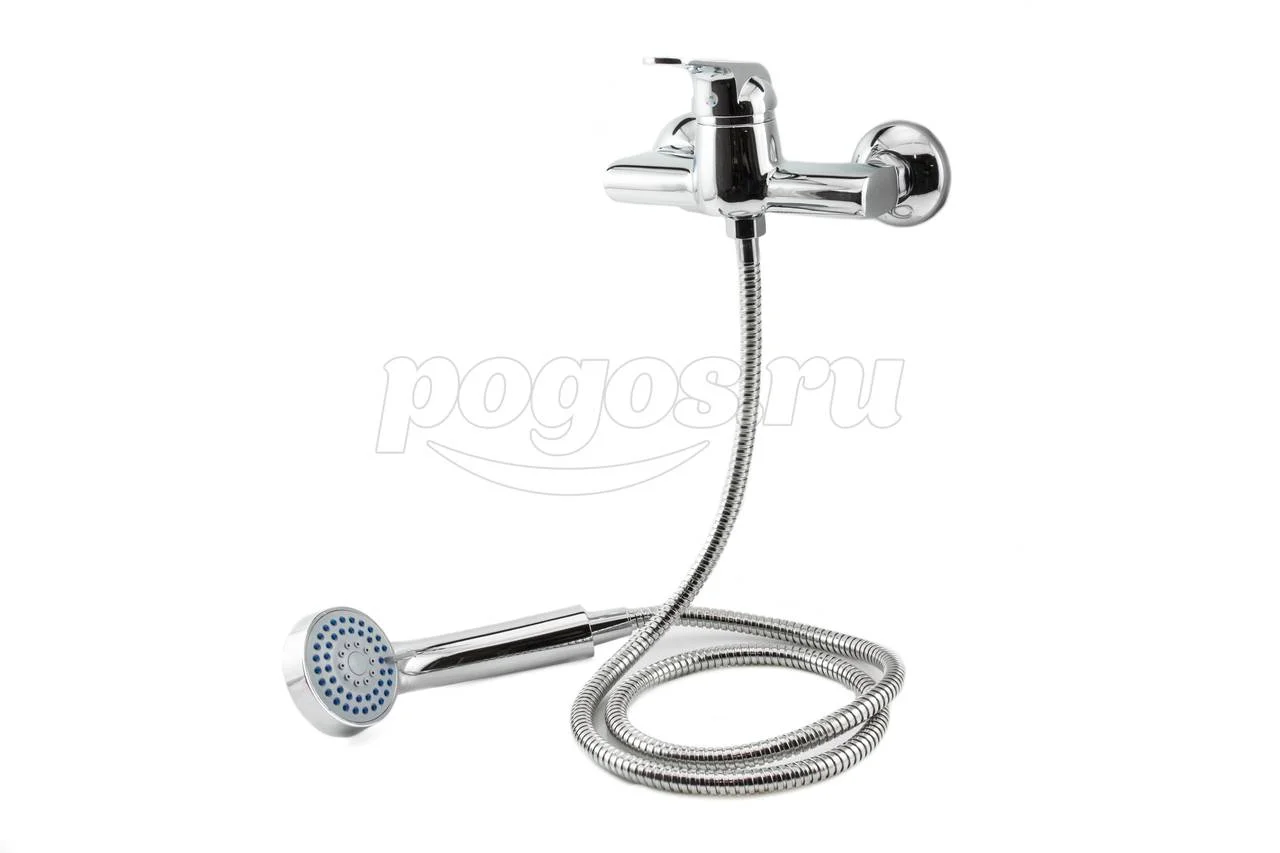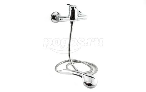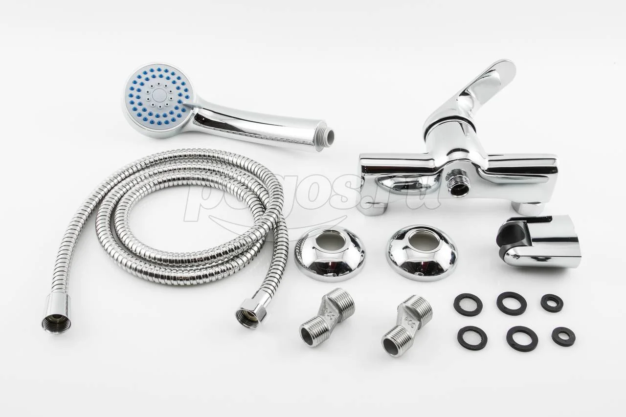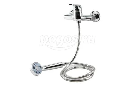 - Комплектация смесителя: переходники для подключения к водопроводу, шланг душевой, лейка однорежимная, настенное поворотное крепление.