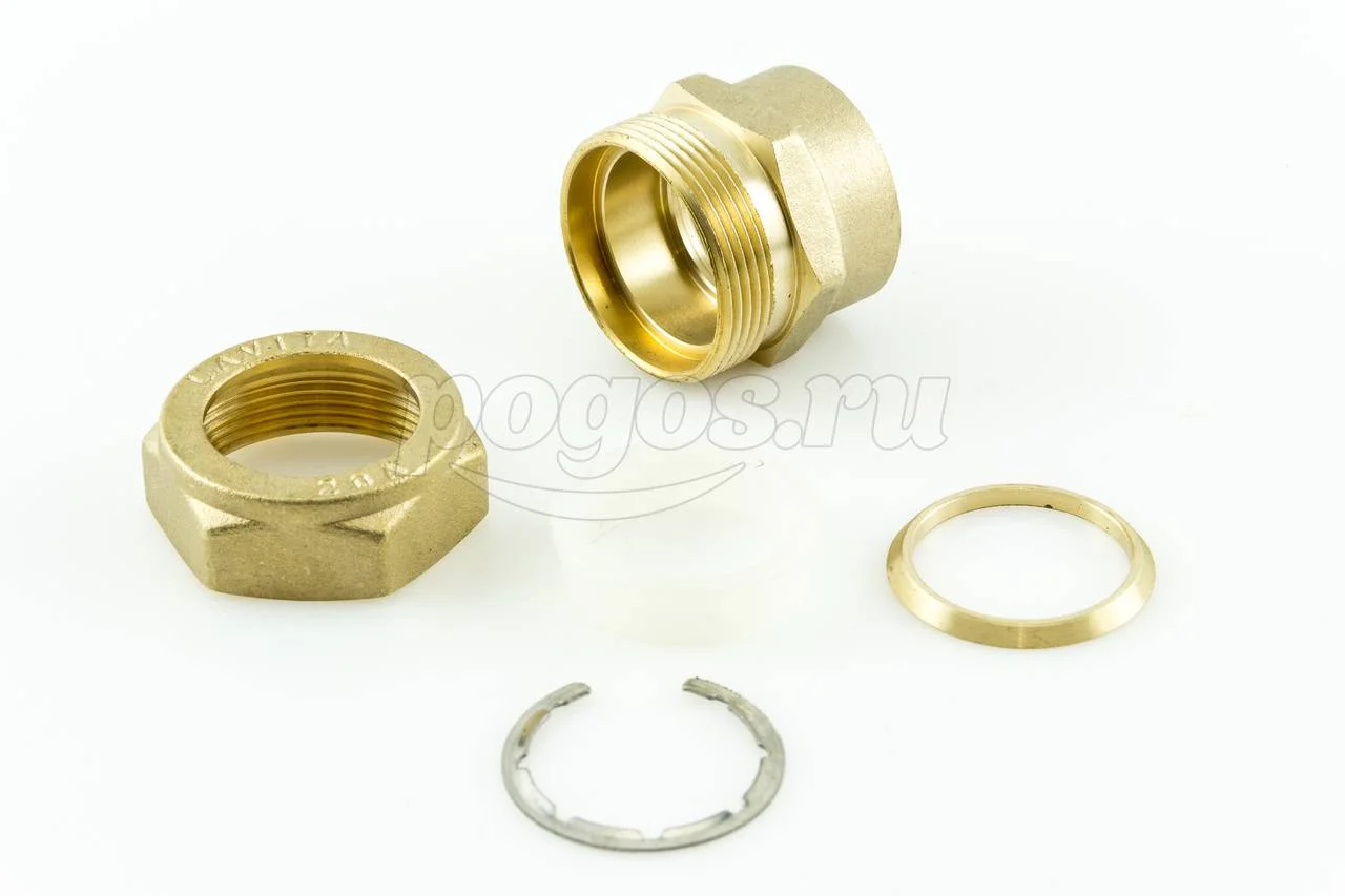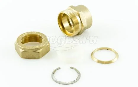 Муфта состоит из корпуса, силиконовой прокладки, обжимного кольца из латуни, стопорного кольца из нержавейки и накидная гайка.