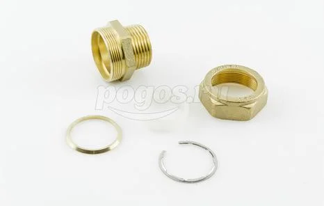 Муфта состоит из корпуса, силиконовой прокладки, обжимного кольца из латуни, стопорного кольца из нержавейки и накидная гайка.