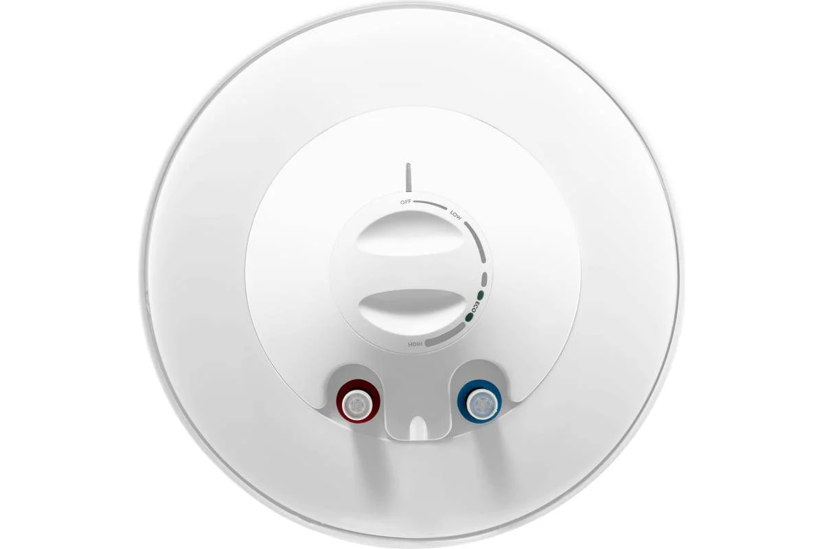 На нижней крышке водонагревателя расположена удобная и интуитивно понятная панель управления. На ней размещены ручка включения прибора, с помощью которой можно задать нужную температуру нагрева воды в диапазоне от 30 до 75°С. Используя функцию экономного режима (положение «ЕCO»), вода будет нагревается до температуры 55°С. При этой температуре, образование накипи сводится к минимуму и позволяет снизить расход электроэнергии.