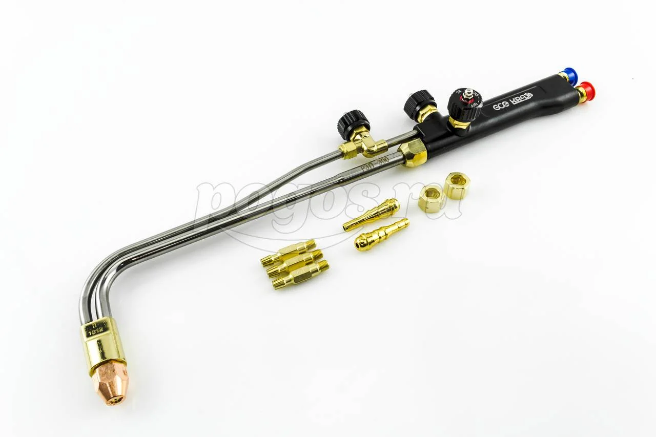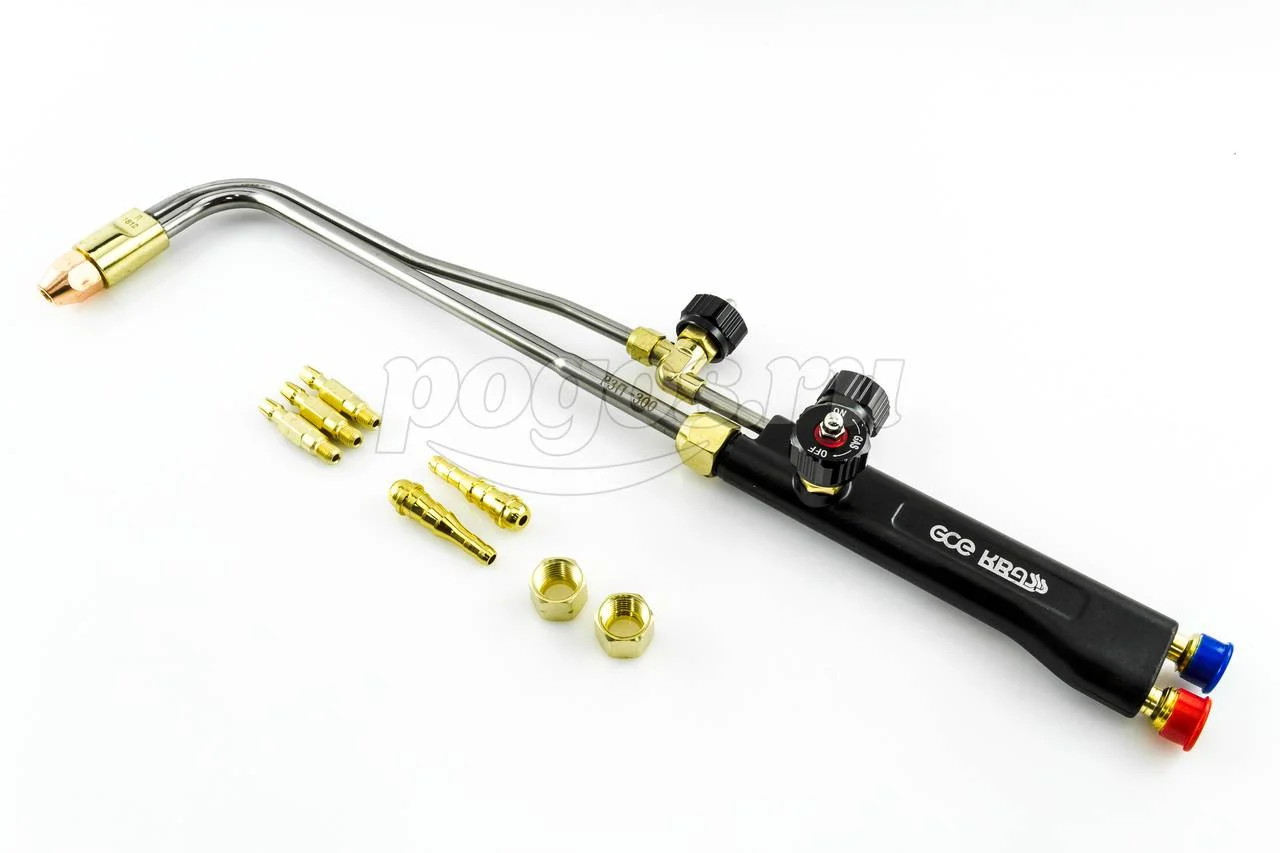 Пропановый резак KRASS Р3П-300 поставляется с комплектом наконечников различного диаметра. Используется для резки металла толщиной до 300 мм на производстве и в авторемонтной сфере.
