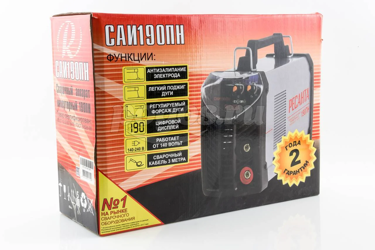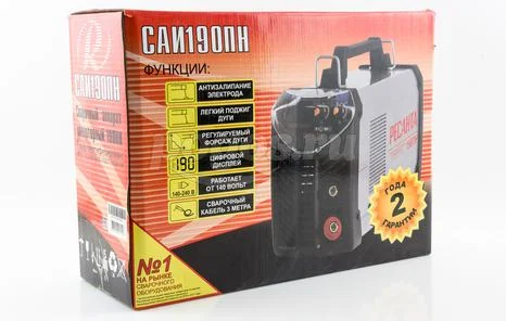 Ресанта САИ 190 ПН предназначен для ремонта и изготовления металлических конструкций, контейнеров, трубопроводов методом ручной дуговой сварки. Обеспечивает стабильную работу при напряжениях питающей сети от 140 до 242 В. Оснащен функциями «ANTI STICK» (антизалипание), «ARC FORCE» (форсаж дуги) и «HOT START» (горячий старт). Построен на IGBT транзисторах. Для удобства контроля работы аппарата на его передней панели расположены светодиодные индикаторы сетевого напряжения и перегрева. Инвертор работает в широком диапазоне температур окружающей среды: от -10 до +40 градусов. Малый вес аппарата позволяет сварщику легко перемещаться по рабочей площадке. Технические характеристики Ресанта САИ 190 ПН: Кейс нет Дисплей да ПВ на максимальном токе, % 70 Max мощность, кВт 5,5 Max ток, А 190 Длина проводов, м 2+1.5 Сварочный провод DX25 TIG сварка нет Min входное напряжение, В 140 Класс товара Полупрофессиональный Наличие сетевой вилки да Степень защиты IP21 Напряжение, В 220 Форса