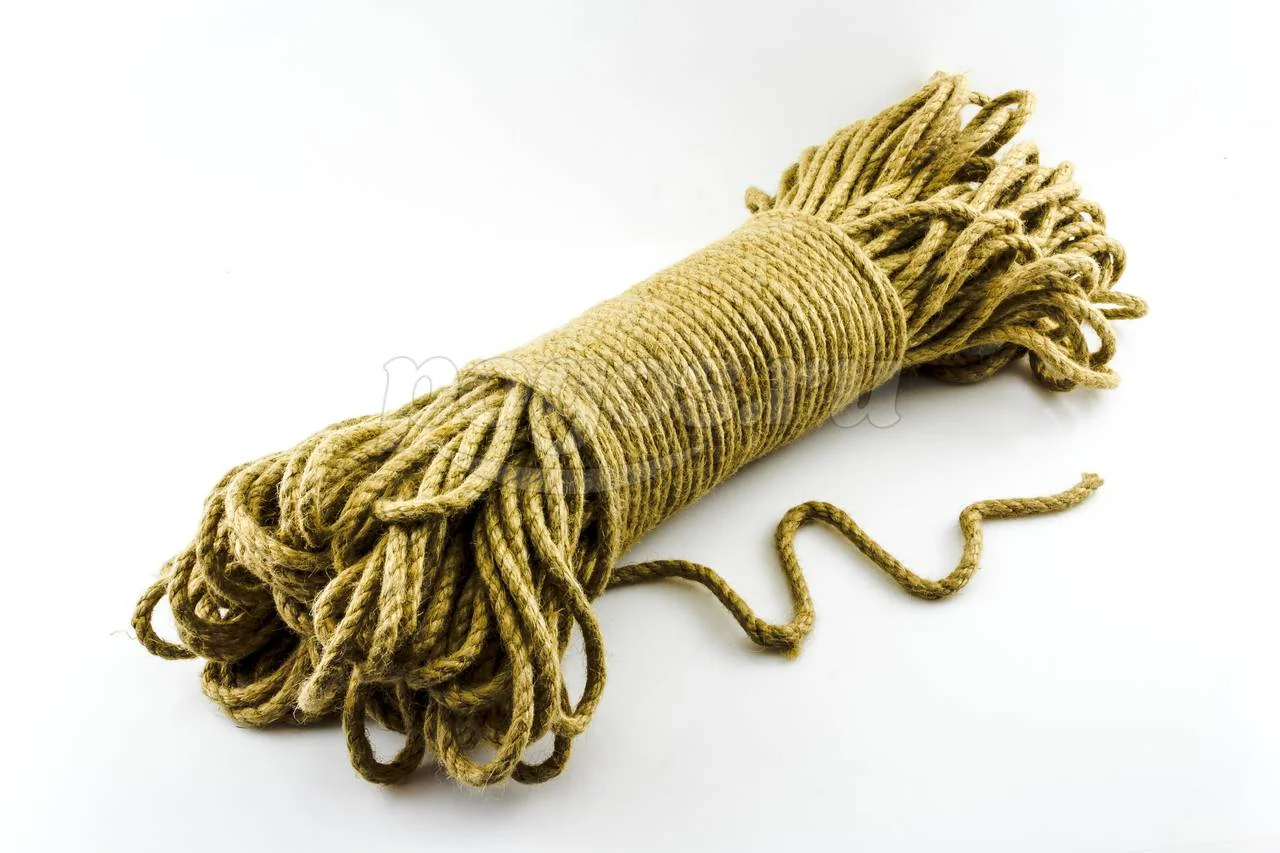Канат джутовый или как его еще называют - веревка джутовая, состоит из 3-х скрученных прядей, диаметр сечения 8мм, длина окружности 25мм. Разрывная нагрузка каната 250кгс.
