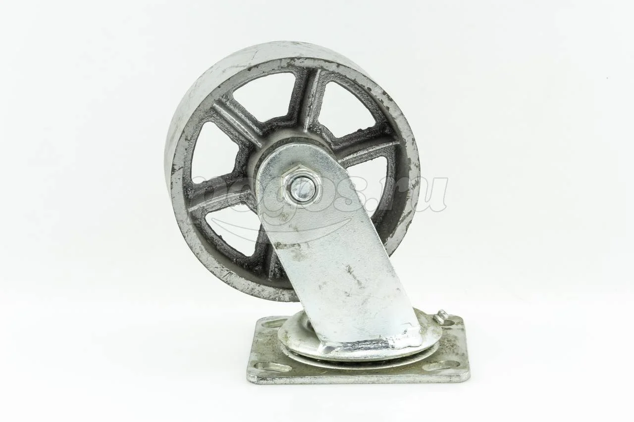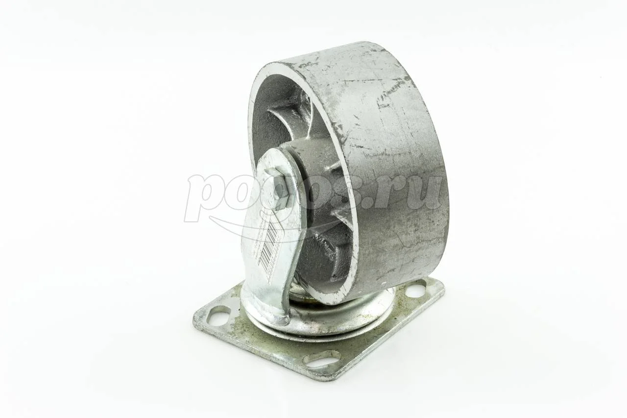 Большегрузные чугунные колеса с креплением площадочного типа и темным ободом поворотные – механизмы, которыми комплектуют различные тележки и иную передвижную технику в производственной, складской, логистической и других сферах.