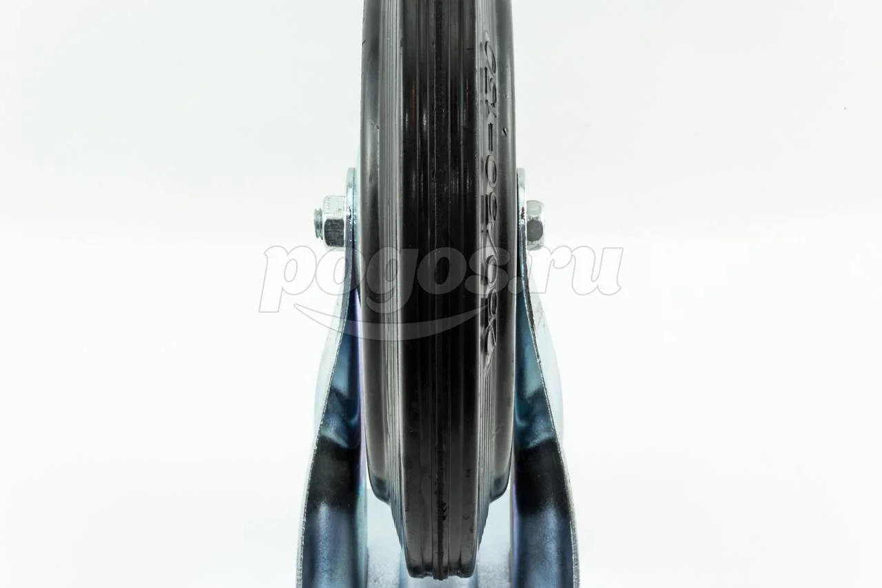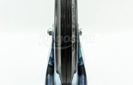 Обод неповоротной промышленной опоры оцинкован, изготовлен из стали. Примененный тип крепления кронштейна - площадка. Материал шинки – это качественная черная литая резина. Вилка крепления колеса к опоре и опорная площадка произведены из листовой стали методом прессования.