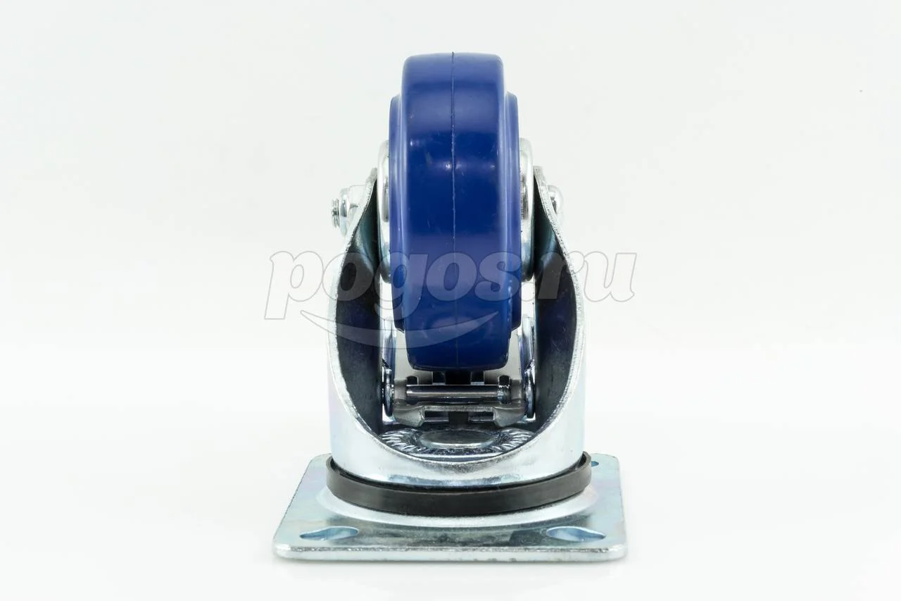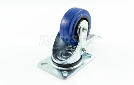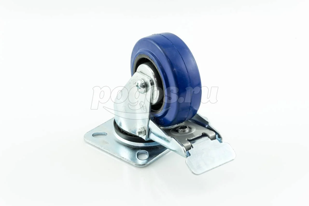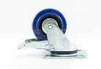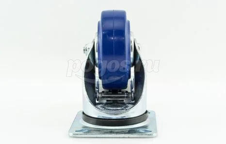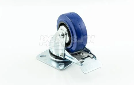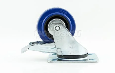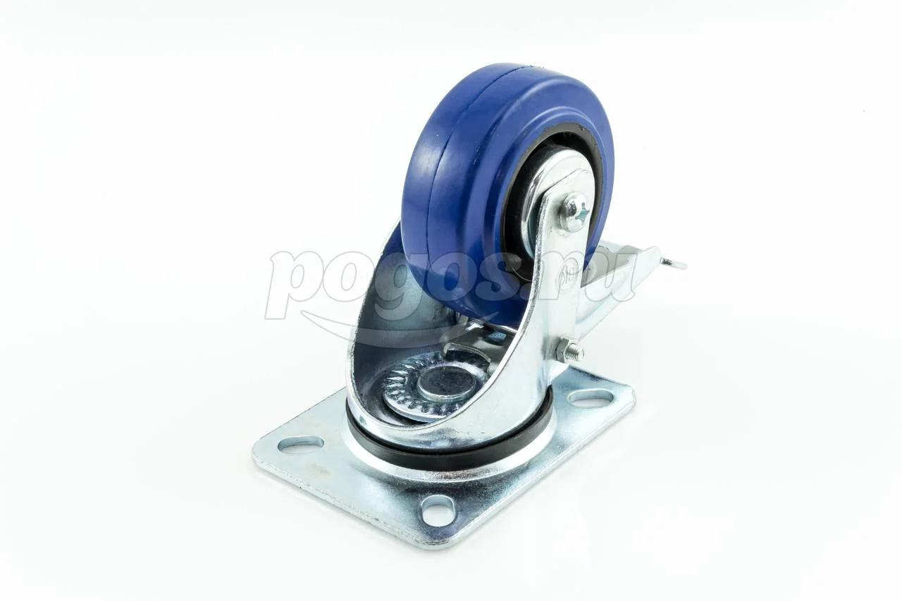 Колесные опоры усиленные, поворотные с тормозом, эластичная синяя резина,обод - из пластика, платформенное крепление, роликоподшипник.